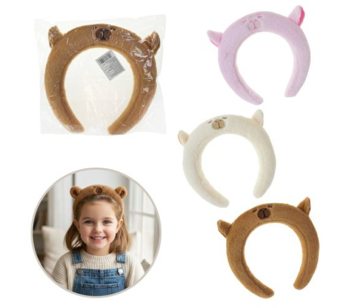 Гарненький та мʼякий обруч з вушками й мордочкою капібари. Досить легкий, еластичкий та приємний на дотик, він чудово підійде для вмивання чи просто, як декоративний аксесуар. Діаметр обруча - 11,5 см (всередині). В рамках артикулу представлений у кількох кольорових варіаціях. Виконано з якісних та безпечних матеріалів. Для дітей старше 3-х років.