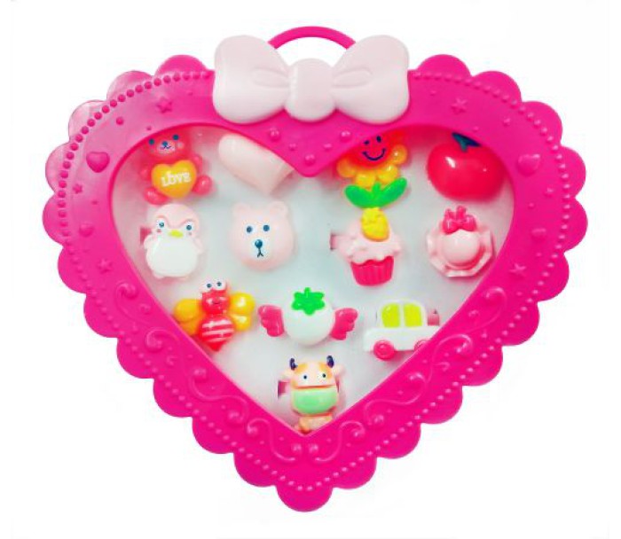 Набір милих дитячих каблучок в гарній упаковці-коробочці у вигляді сердечка. Кільця прикрашають різні фігурки у вигляді тварин, фруктів і квіточок. Виготовлені з пластику. 12 штук в комплекті.