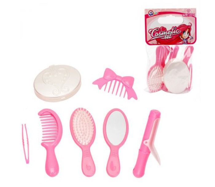 Цікавий ігровий набір для маленької модниці. У комплекті: плойка, дзеркальце, пінцет, гребінець, гребінь, заколочка-гребінь і палетка косметичка. Косметичка в наборі є бутафорією. Набір виготовлений з якісного і безпечного пластика.