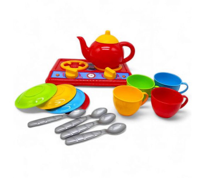 Набір яскравою пластикової посудкі. У комплекті: плита з 2-ма конфорками (22 х 16 см), чайничок, 4 чашечки, 4 блюдця і 4 чайні ложечки.
