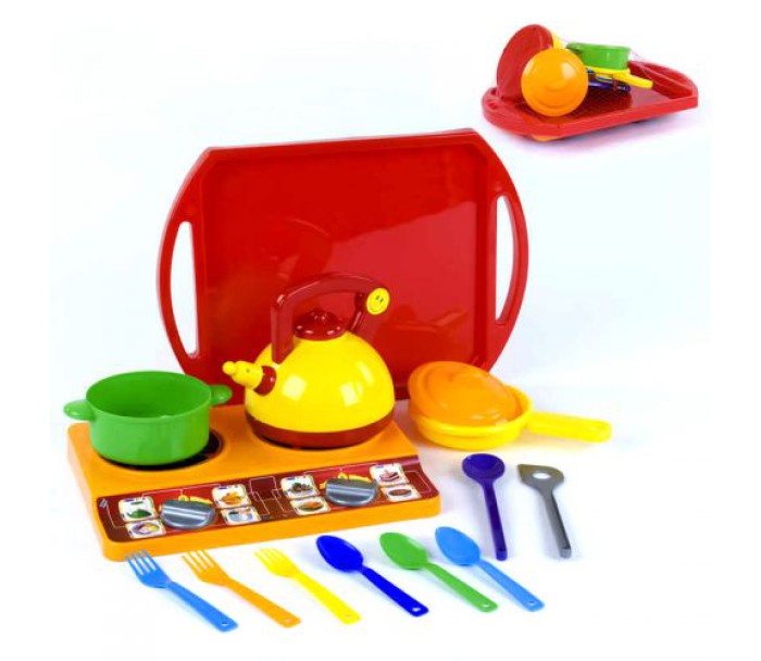 Набір яскравою пластикової посудкі. У комплекті: піднос (37 х 26 см), плита на 2 конфорки, чайник, каструлька з кришкою, сковорідка, 3 ложки, 3 вилки і 2 прилади для готування.