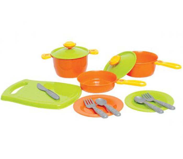 Кухонний набір 1 Технок. Набір складається з 14 елементів, а саме: з сотейник, сковороди, каструлі, досточки для нарізки, кришки - 2 шт., Тарілки - 2 шт., Ложки - 2 шт., Вилки - 2 шт., Ножа - 2 шт.