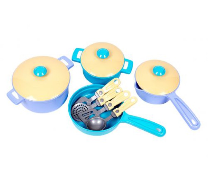 Пластиковий кухонний набір, в жовто-блакитних кольорах. У комплекті йдуть: 2 каструлі, сковорідка, сотейник, три кришки до них, а також черпак, шумовка, велика кухарська вилка і лопатка.