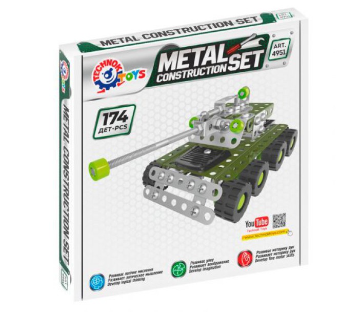 Металевий конструктор "Танк" на 174 деталі. Завдяки цій іграшці дитина отримує перші навички з'єднання деталей гвинтами і гайками, розвиває фантазію і просторову уяву.