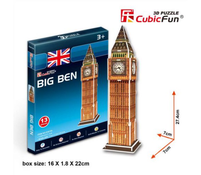 3D пазли Cubic Fun виглядають зовсім к справжні і з історичною точністю повторюють кожну деталь зовнішнього вигляду світових архітектурних споруд. Біг Бен - колокольна вежа у Лондоні. Офіційна назва Часова вежа Вестмінстерського палацу, також її називають Вежею Святого Стефана. Вежа була збудована у 1858 році, годирнник на вежі був запущен 21 травня 1859 року. Висота Біг Бену становить 61 метр (не враховуючи шпиль). Годинник розташований на висоті 55 метрів від землі. При діаметрі циферблату у 7 метрів і довжиною стрілок у 2,7 и 4,2 метри, годинник довгий час вважався найбільшим у світі. Біг Бен став одним із найвпізнаваніших символів Великобританії.