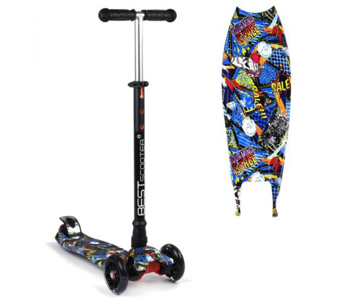 Самокат чотириколісний "Best Scooter". Передні - 12 см, задні здвоєні - 7,5 см, все зі світлом. Рама і кермо - алюміній; дека - пластик; колеса - поліуретан. Висота керма - від 62 до 84 см. Максимальне навантаження - 60 кг. Задній ножні гальма.