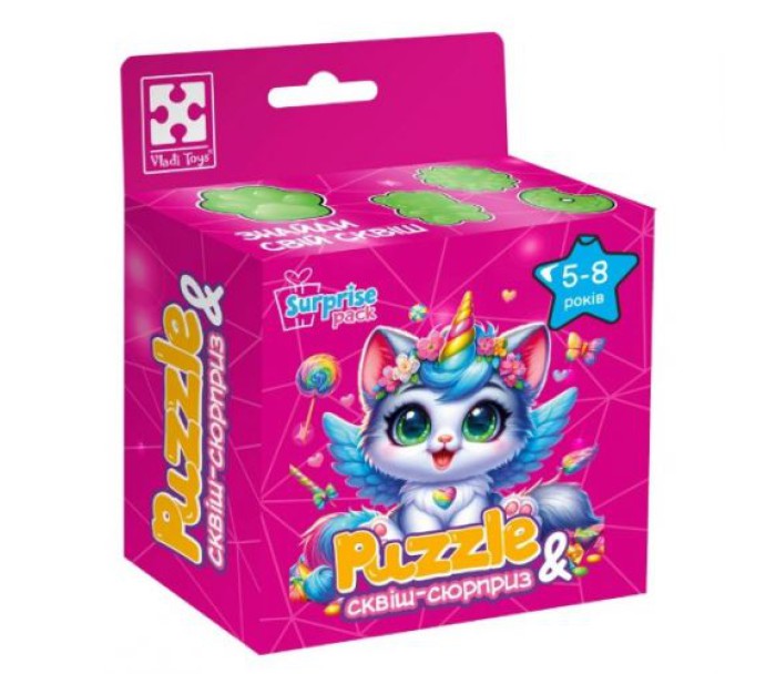 Набір пазлів "Котик-Єдиноріжка"- це захоплива можливість зібрати яскраву картинку, а за свої старання отримати ще й подарунок-сюрприз у вигляді сквішика-рандомки! У комплекті 180 різноманітних деталей, виготовлених із міцного картону. Пазли допомагають розвивати логічне мислення, дрібну моторику та посидючість. Для дітей віком від 5 років.