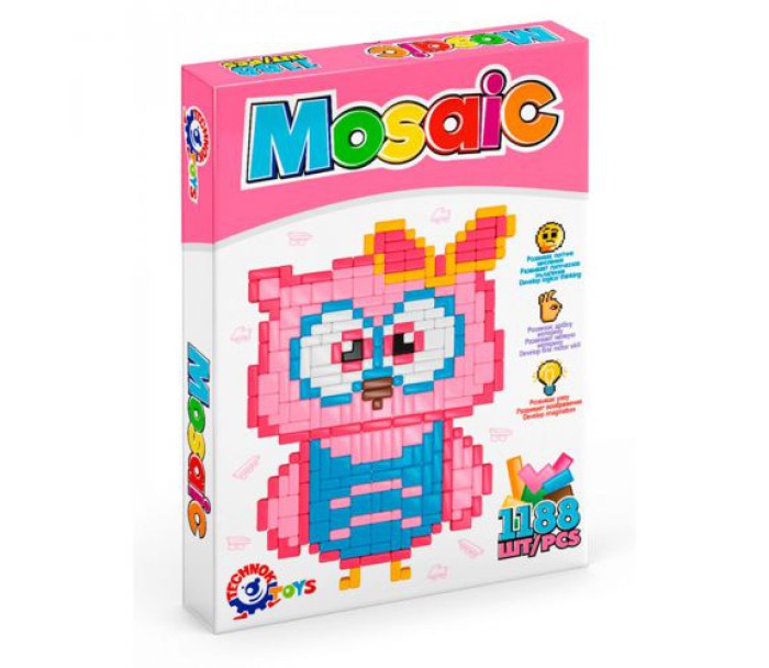 Ігровий набір "Мозаїка". Дозволяє створювати яскраві, цікаві картинки з пластикових деталей. Розвиває логічне мислення, дрібну моторику, уяву. Розмір поля - 26,5х19,5 см. У наборі, також, є 1188 деталей (9 кольорів) мозаїки різної форми і вкладиш з прикладами зображень, які можна створити. Виконано з якісного пластику.