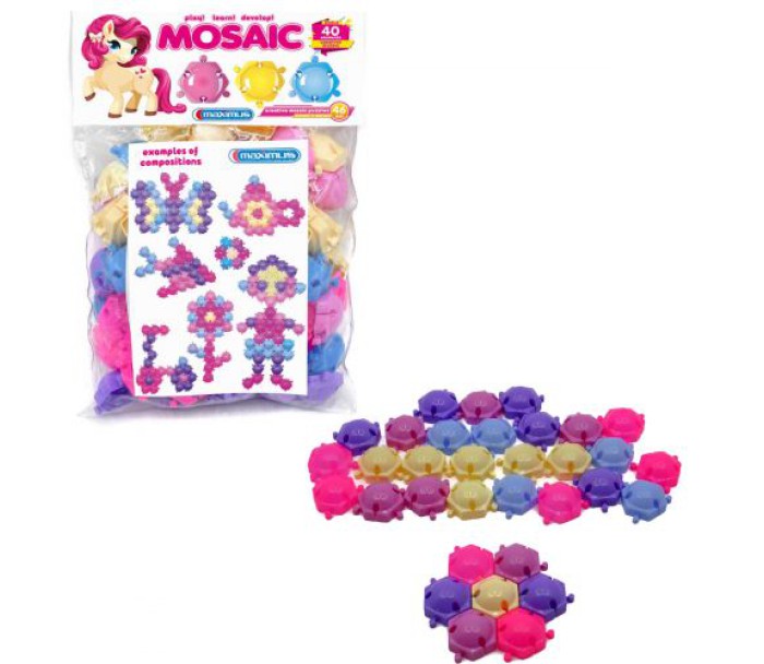 Яскрава мозаїка пазл складається з 40 яскравих пластикових детальок 5-ти кольорів, які можна з'єднувати між собою. Розмір однієї детальки: 4 х 2,5 см. Гра з мозаїкою розвиває мислення, уяву та дрібну моторику. За допомогою деталей можна створювати будь-яку фігуру або навіть малюнок. Підходить для дітей від 3-х років.