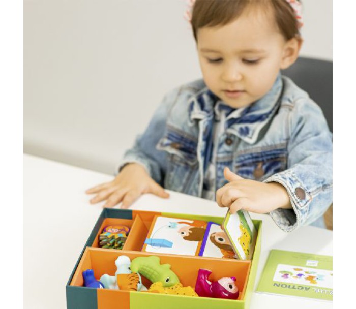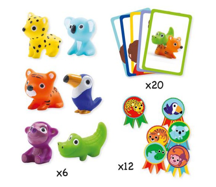 Комплектація: У комплект входять: - інструкція; - 12 призових фішок; - 20 карток із завданнями; - 6 фігурок різних тварин: коали, тигра, крокодила, леопарда, мавпочки та тукана.