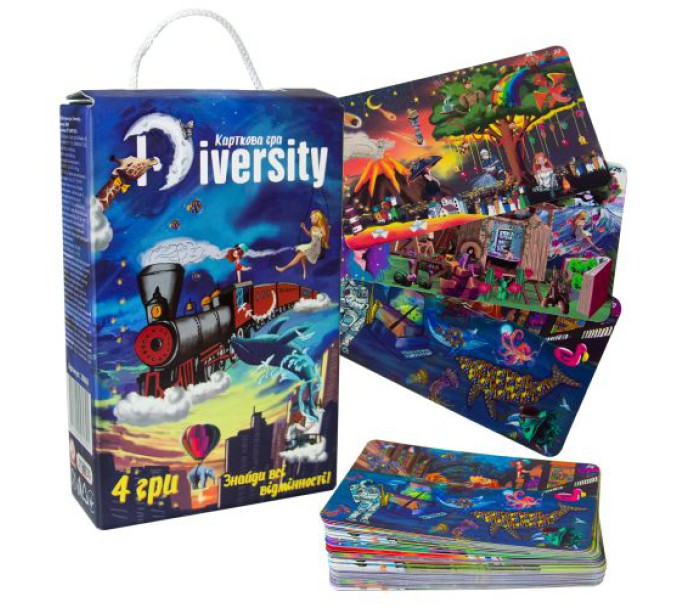 Настільна гра "Diversity". Виберіть один з чотирьох видів карток, покладіть одну картку в центр, а інші поділіть між гравцями. Кожному гравцеві потрібно знайти 2 відмінності між своєю карткою і центральною. Знаходить - поміщає свою картку в центр, і всі тепер шукають відмінності по новій картці. Перемагає той, хто першим позбудеться усіх своїх карт. Для дітей від 10 років.