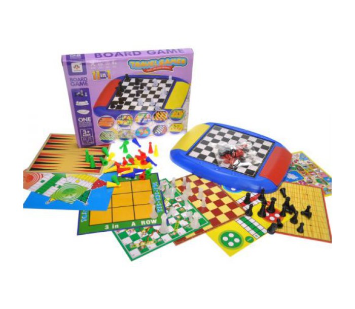 Ігровий набір 11в1: шахи, шашки, нарди, змії та сходи та інші захоплюючі настільні ігри. Граючи в ці ігри, дитина розвиватиме логічне мислення, кмітливість, уважність та посидючість. Ігрова дошка пластикова, з боків є відділення для зберігання фішок та кубиків. У наборі є 11 карток із змінними ігровими полями. Розмір дошки: 22х18х2 см.
