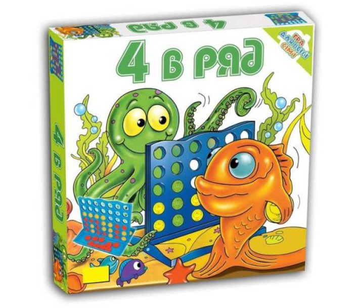 "4 в ряд"- гра для всієї сімʼї. Правила гри: Встановіть пластикову основу для гри. Кожен гравець обирає собі жетони одного кольору і складає їх у нішу зі своєї сторони основи. Першим починає гру наймолодший гравець. Під час свого ходу гравець кидає зверху в пластикову основу один жетон свого кольору. Потім хід переходить до іншого гравця, який теж кидає в основу жетон свого кольору.. Мета гри - викласти в ряд 4 жетони свого кольору. Жетони можна викладати в ряд і по вертикалі, і по горизонтілі, і по діагоналі. Гравець, який першим сскладе в ряд 4 жетони свого кольору, стає переможцем.