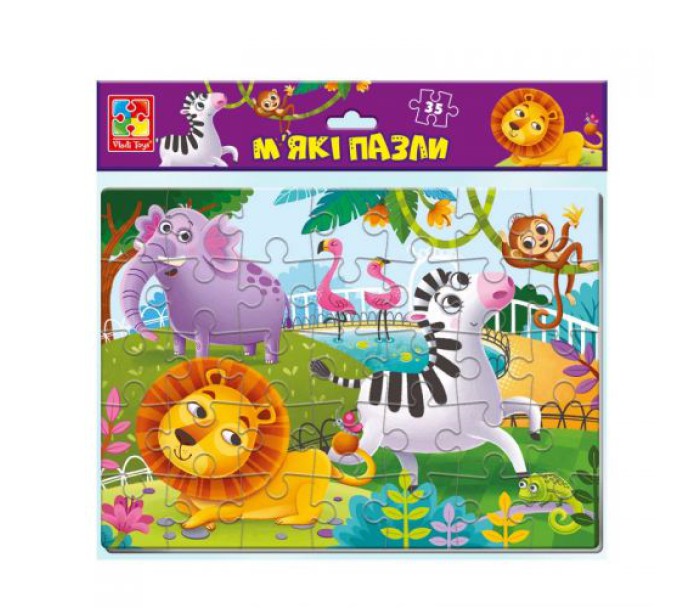 Яскраві м'які пазли на 35 елементів. Великі, м'які і приємні на дотик деталі. Розмір готового малюнка 33 х 23,5 см.