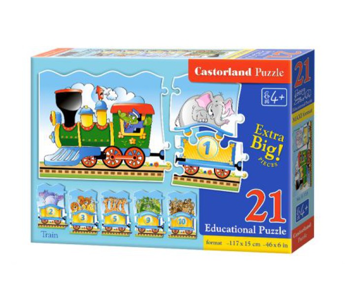 Яскраві барвисті навчальні пазли на 21 деталь. Розмір готової картинки: 117 х 15 см. Розвивають логічне мислення, дрібну моторику рук, посидючість. Вчать цифрам і рахунку. Для дітей, віком від 4-х років.