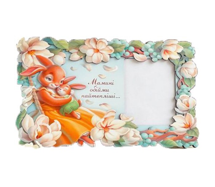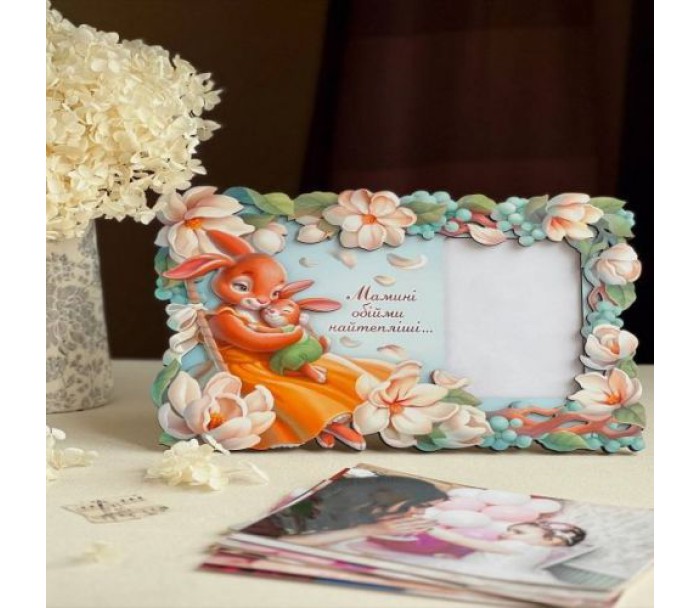 Деревʼяна фоторамка для дитячих фотографій - це не просто предмет декору, це своєрідний артефакт, який зможе зберегти в собі не лише красу моментів, що зображені на фотографіях, а й тепло, турботу та любов материнських обіймів. Саме цю ідею передає напис на рамці: "Мамині обійми найтепліші". Розмір рамки: 23х32 см.