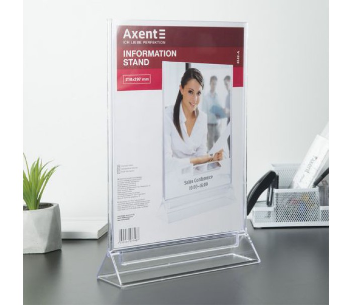 Двосторонні інформаційні таблички широко використовуються для розміщення реклами та іншої інформації при роботі з клієнтами - в банках, ресторанах (наприклад, спеціальні меню), на рецепції готелів, в салонах краси і т.д. Табличка інформаційна двостороння Axent виготовлена ​​з кришталево прозорого пластику (полістиролу), який не порушує передачу кольору і чіткість зображень. Зручна виїмка для пальців дозволяє легко замінити вкладиш в табличці.