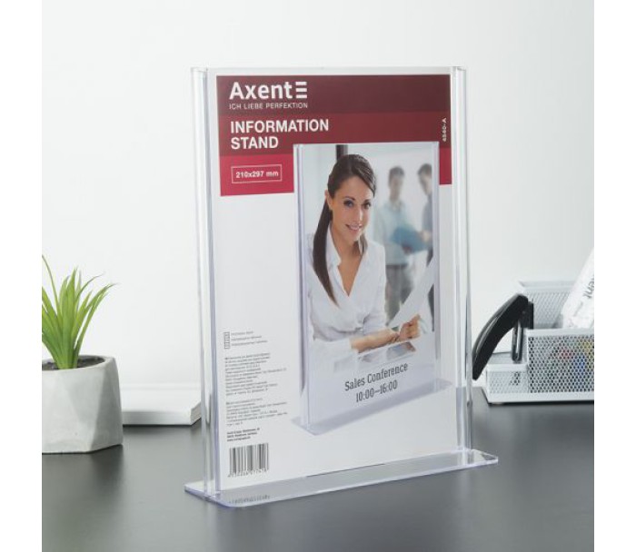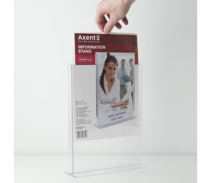 Двосторонні інформаційні таблички широко використовуються для розміщення реклами та іншої інформації при роботі з клієнтами - в банках, ресторанах (наприклад, спеціальні меню), на рецепції готелів, в салонах краси і т.д. Табличка інформаційна двостороння Axent виготовлена ​​з кришталево прозорого пластику (полістиролу), який не порушує передачу кольору і чіткість зображень. Зручна виїмка для пальців дозволяє легко замінити вкладиш в табличці.