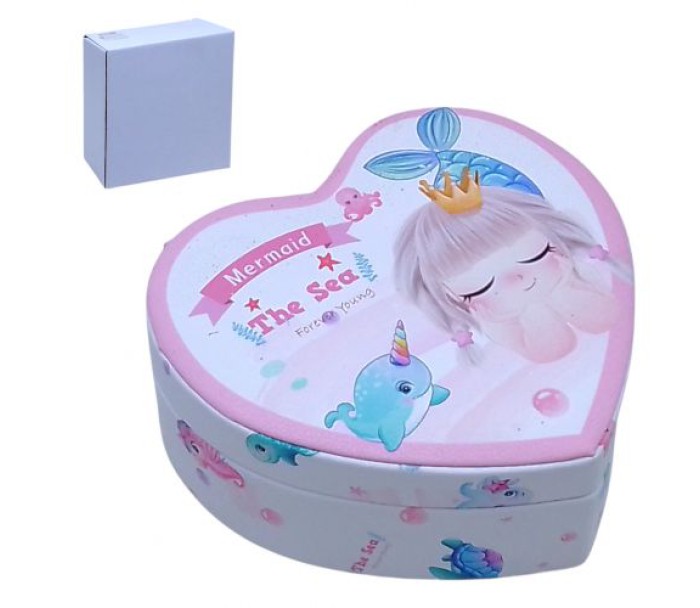 Дитяча скринька для прикрас у формі серця – це не тільки зручний, але й стильний аксесуар для маленької модниці. Прикрашена яскравим принтом із русалочкою, вона стане справжньою прикрасою дитячої кімнати. Усередині шкатулки є дзеркальце та кілька відсіків для акуратного зберігання кільця, сережок та ланцюжків. Мʼяке покриття з високоякісного шкірозамінника додає виробу стильності та приємних тактильних відчуттів.