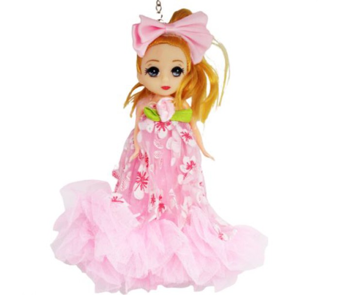 Красива лялечка, яку можна прикріпити до сумки, одягу або ключів за допомогою металевого кільця. Одягнена в пишну фатинову сукню, прикрашену квіточками та оборками. Волосся завʼязане в хвіст за допомогою резинки. Розмір лялечки: 7х4х6 см. Виконана з якісних та міцних матеріалів.