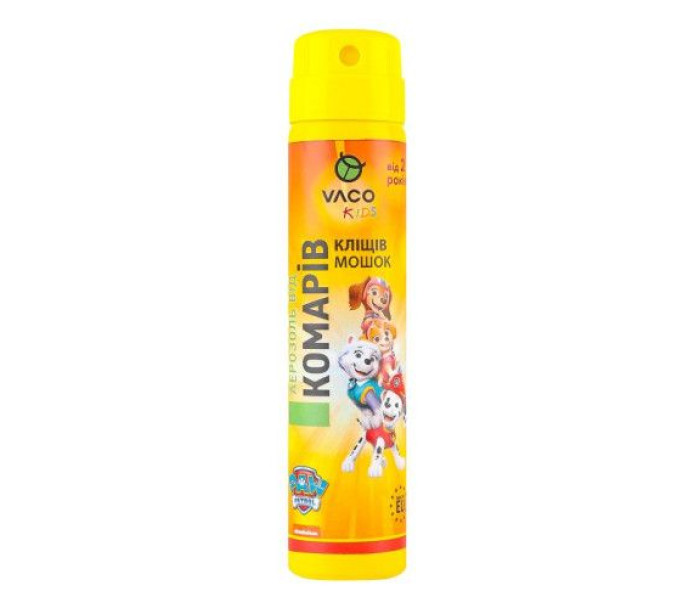 Аерозоль VACO KIDS PAW PATROL — ефективний засіб для захисту дітей від 2 років від укусів комарів, кліщів і мошок. Має приємний аромат, зручний у використанні, з яскравим дитячим дизайном у стилі «Paw Patrol».