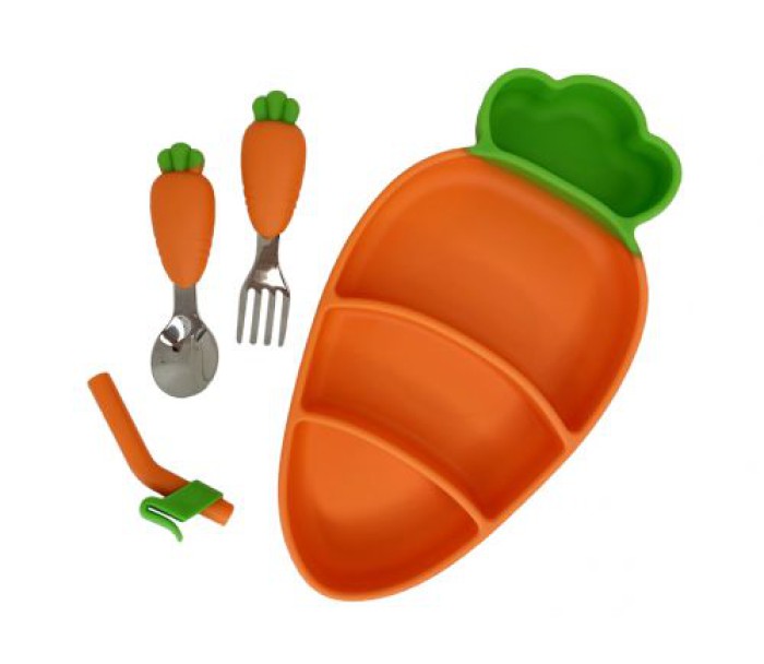 Яскравий набір столових приладів, який неодмінно сподобається малюкам. У набір входить силіконова тарілочка, розділена на три секції, силіконова трубочка, а також ложка та вилка з силіконовими ручками, виконаними у вигляді моркви. Розмір тарілки: 24х13х3 см. Довжина столового приладдя: 10 см.