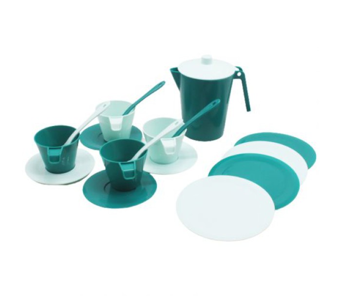 Дитячий набір пластикового посуду складається з 17 елементів. У наборі: 4 чашки, 4 маленькі блюдечка, 4 блюдечка побільше, 4 ложечки та чайник. Набір виконаний з якісного та безпечного пластику, упакований у зручну сумочку.