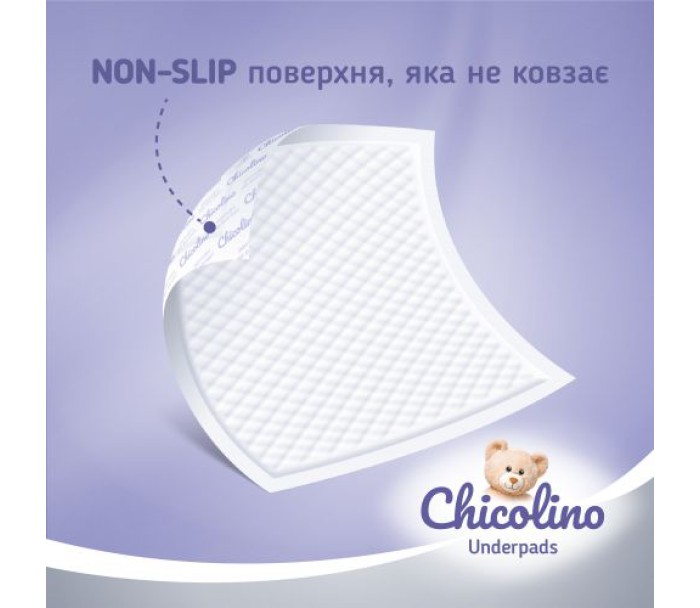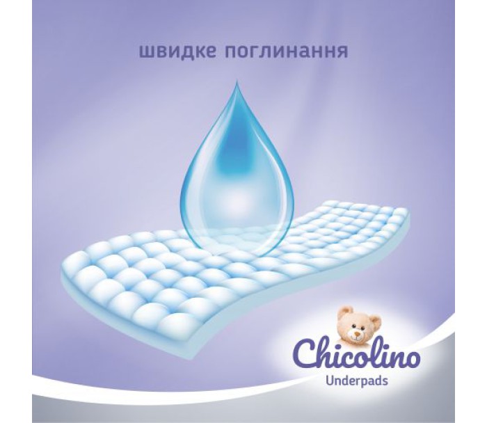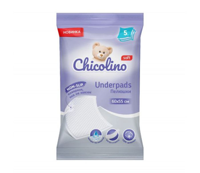 Пелюшки поглинаючі Chicolino зручні та незамінні при зміні підгузка та проведенні інших гігієнічних процедур. Водонепроникний нижній шар забезпечують надійний захист ліжка та інших поверхонь від протікання вологи, та має властивість «non-slip», що не дозволяє пелюшкам ковзати по поверхні. 100% розпушена целюлоза у складі пелюшки робить її комфортною, м’якою та безпечною у використанні.