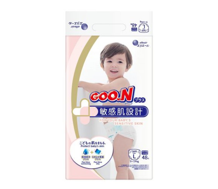 Японські підгузки Goo.N Plus для дітей (L, 9-14 кг) враховують особливості шкіри малюків* та запобігають подразненням та сухості.