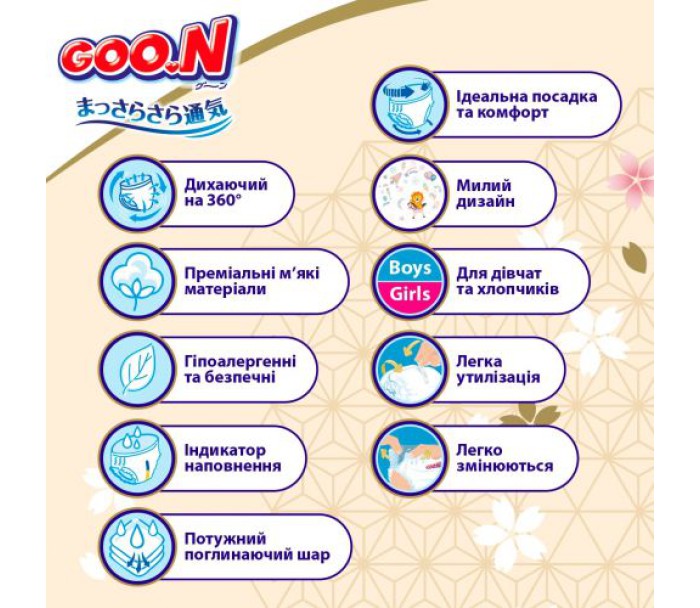 - Goo.N Premium Soft - це унікальне поєднання японських технологій та вподобань європейських батьків. Виготовлені з м'яких матеріалів, трусики-підгузки мають класичну "європейську конструкцію" з еластичним пояском та липучками.