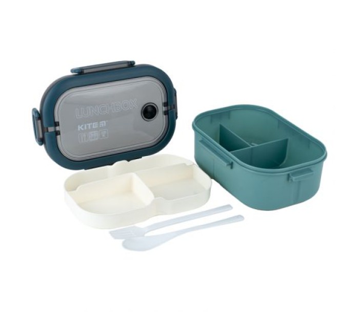 Ланчбокс Kite зроблений з харчового пластику. Бокс призначений для зберігання ланчу. Основа розділена на 3 відділення, має додатковий розділювач-тарілку, доповнений столовим приладдям. Він щільно закривається. Ланчбокс також можна використовувати як лоток для зберігання їжі в холодильнику. Об'єм 1200 мл.