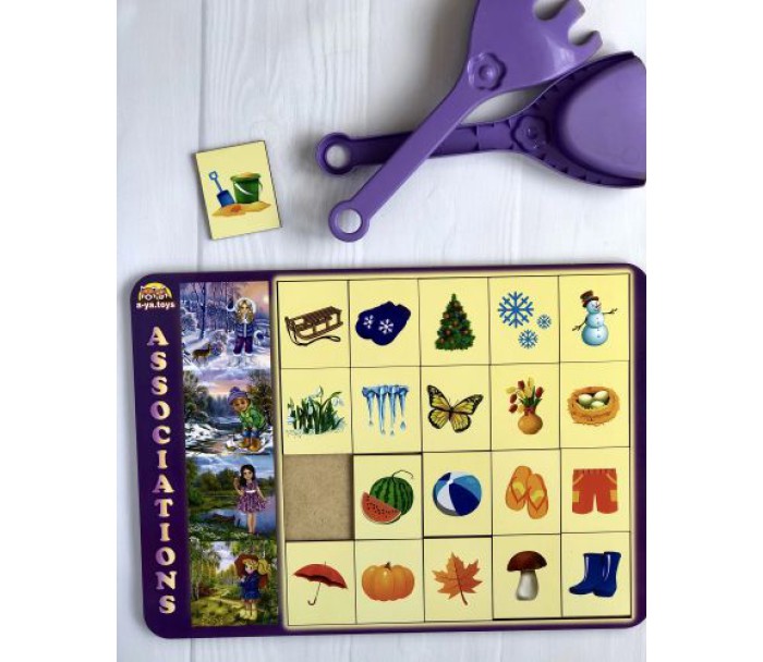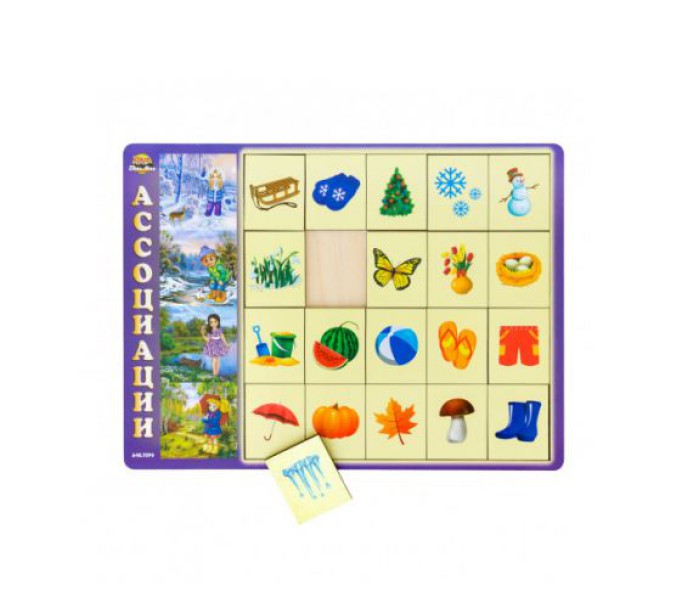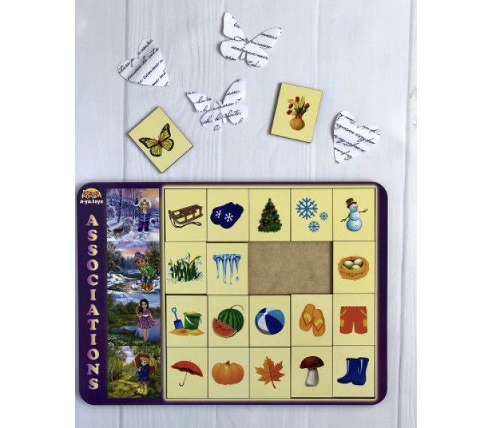 Дерев'яна гра "Асоціації". Складається з планшета і дерев'яних фішок. Потрібно вибудовувати асоціативний ряд. Відмінно тренує дрібну моторику, логіку, пам'ять, увагу, мислення. Розмір рамки - 32,5х23 см.