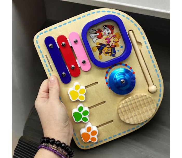 Багатофункціональна панель - натхнення для маленького музиканта. Подарує малюку багато годин захопливої імпровізації. 4 музичні інструменти: ксилофон, тріскачка, тарілка та барабан. 3 тумблери-лапки, які можна рухати вниз та вгору. Яскраві кольори та персонажі улюбленого мультфільму зроблять гру ще цікавішою.