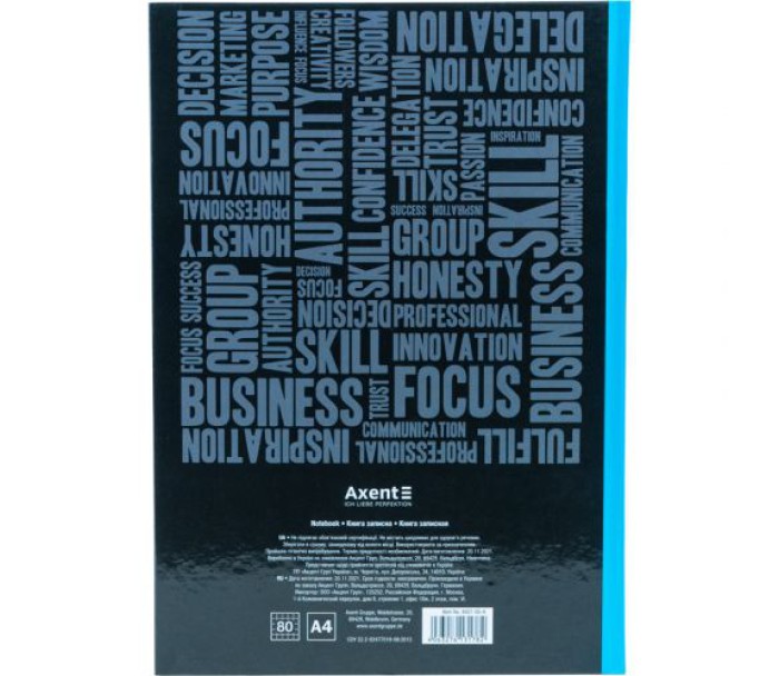 Записна канцелярська книга Axent призначена для щоденних записів, ведення обліку, замальовки схем, графіків, фіксації великого обсягу інформації. Тверде переплетення і обкладинка гарантують збереження акуратного зовнішнього вигляду під час користування. Білий папір в клітинку забезпечує комфортне письмо. Розмір клітинки 5x5 мм. Кількість аркушів - 80. Щільність паперу 55г/м2. Формат - стандартний, А4. Глянцева ламінація на обкладинці.
