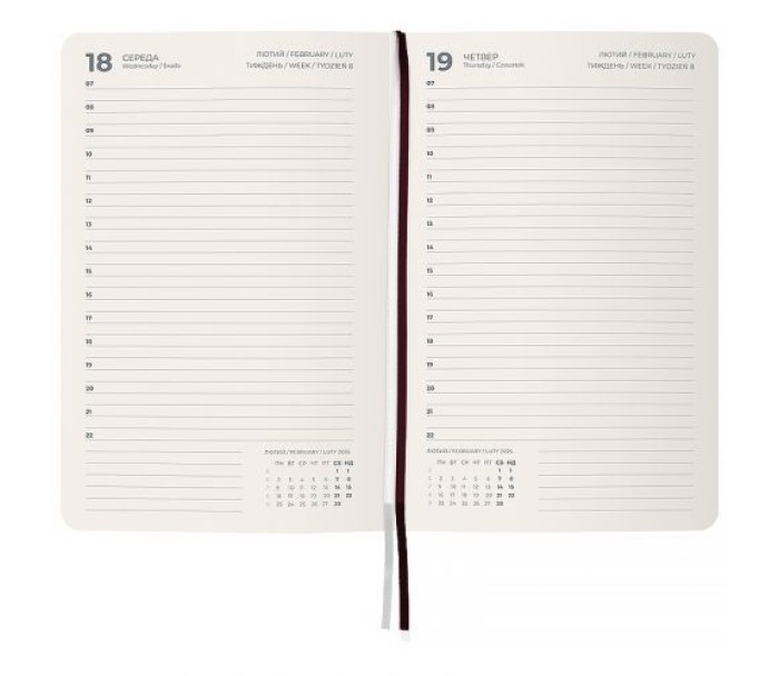 Дві різнокольорові закладки-ляссе дозволяють швидко знайти та відкрити потрібні сторінки. Містить 168 аркушів, розмір - 145*210 мм. Кишені на форзаці немає. Немає тасьми на обкладинці та петлі для ручки.