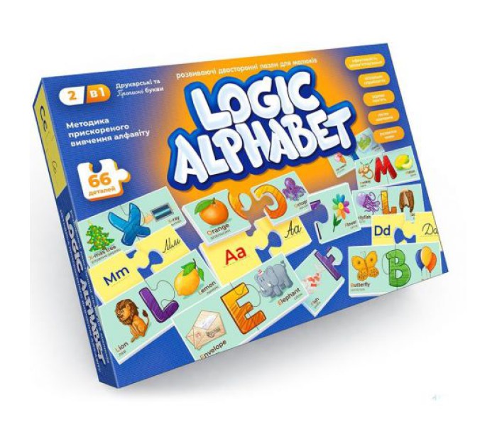 Развивающие двухсторонние головоломки-пазли для малышей. Помогут с легкостью изучать английский алфавит. Улучшают визуальное восприятие, зрительную память, развивают речь. На каждой детали пазла есть рисунок, названия изображения на английском и русском языке. Из двух деталей пазла можно сложить букву. В комплекте 66 деталей пазла.