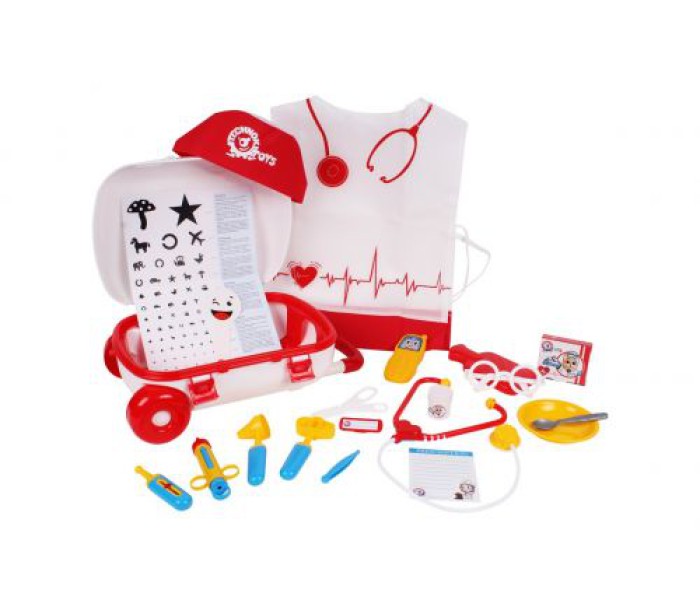 Комплектація: Фонендоскоп, Таблетница, шприц, градусник, ложечка, окуляри, молоточок, бланк, грілка, табличка для перевірки зору, а, так само, костмчік і шапочка лікаря.