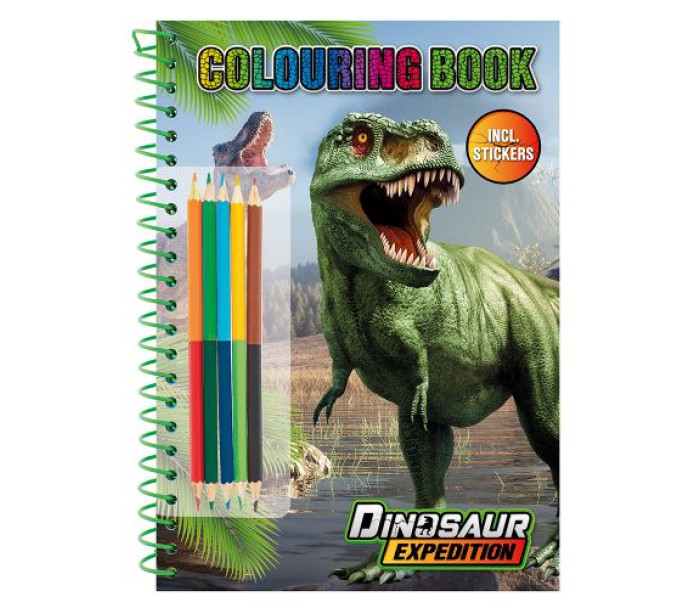 Розмальовка 30 аркушів, 3 аркуші наліпок, 5 двосторонніх кольорових олівців. Розфарбовуй динозаврів та створюй яскраві малюнки за допомогою наліпок.
