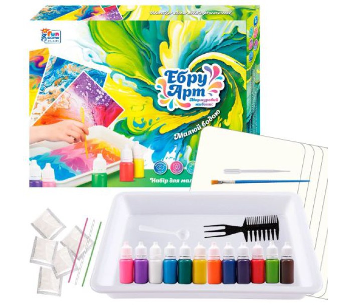 Комплектація: 12 пляшечок з фарбами-пігментами різних відтінків; 10 аркушів А4 акварельного паперу; 5 пакетиків з каррагінаном; містка ємність для малювання; піпетка; пластикові стеки для змішування відтінків; пензлик; мірна ложка; гребінець.