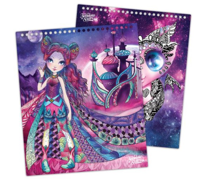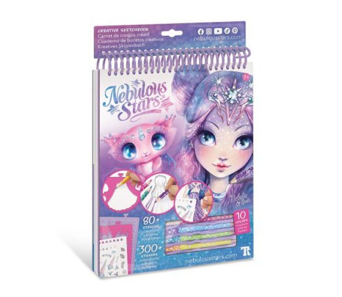 Комплектація: скетчбук, 2 аркуші з трафаретами на 80 графічних елементів, 5 кольорових олівців, 3 візерунки для створення відбитків технікою втирання, наліпки, 8 технік малювання, Буклет з історією Небулії, Теорія кольору, Інструкція.