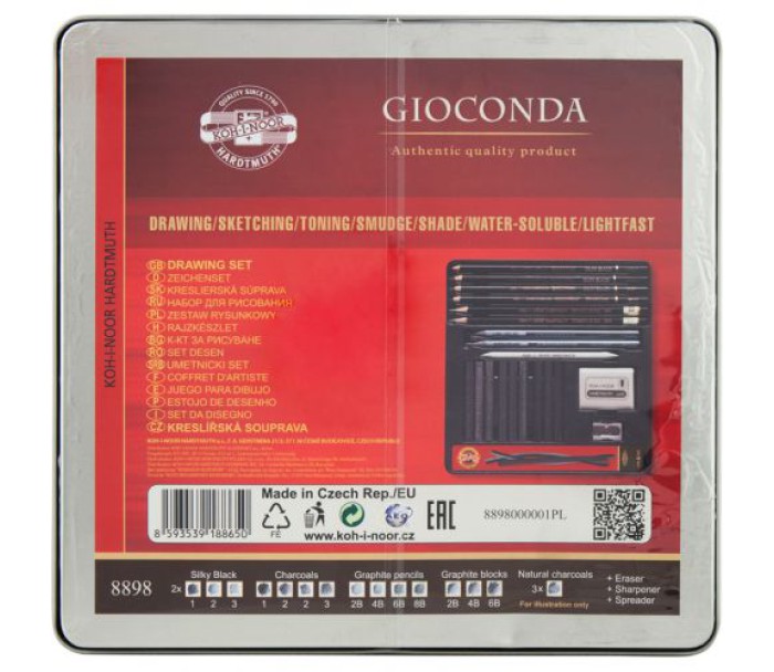 Набір художній Gioconda 8898 у подарунковій металевій упаковці. До набору входять 23 предмети: 2 графітних олівця, 9 художніх бруски, растушевка для пастелі, гумка-клячка, точилка, 6 художніх олівця, 3 вугольні палочки.