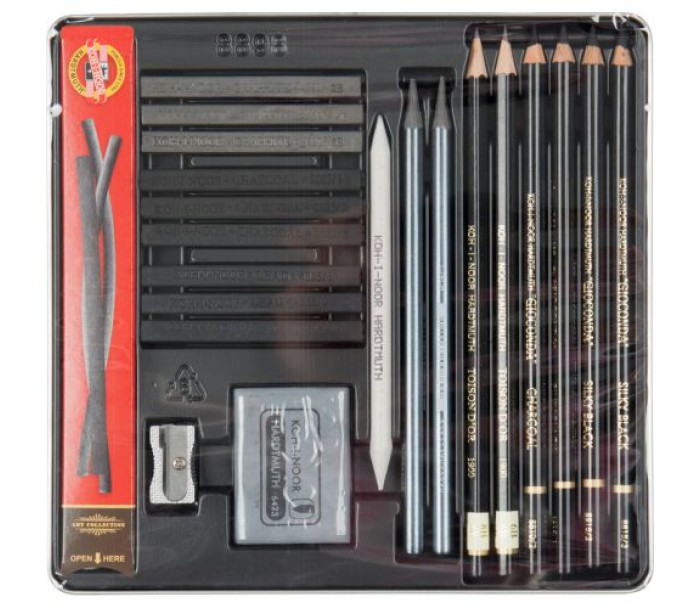 набір, художній, gioconda, 8898, подарунковій, металевій, упаковці, набору, входять, предмети, графітних, олівця, художніх, бруски, растушевка, для, пастелі, гумка, клячка, точилка, вугольні, палочки, KOH-I-NOOR