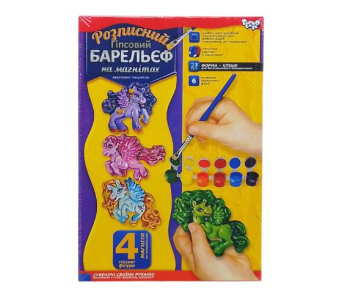 Комплектація: Форма для 4-х фігур, гіпсовий порошок, 6 кольорів фарби, пензлик, магнітна стрічка, інструкція