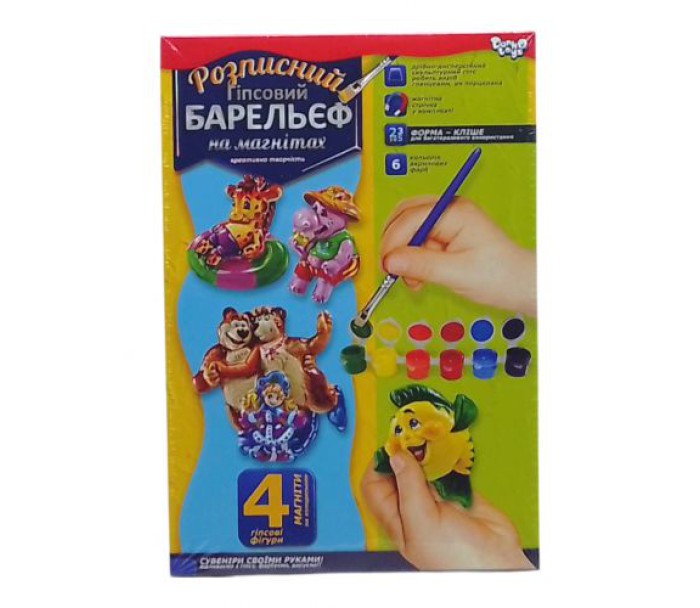 Комплектація: Форма для 4-х фігур, гіпсовий порошок, 6 кольорів фарби, пензлик, магнітна стрічка, інструкція
