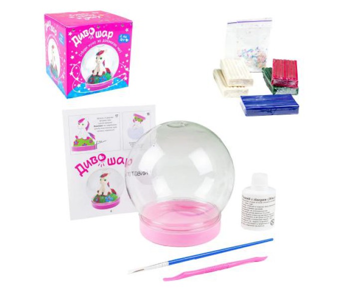З набором для творчості "Диво-куля" дитина зможе створити гарну іграшку власними руками. їй належить зліпити зі спеціального пластиліну милого поні на галявині, помістити його в прозору кулю і залити чарівним розчином із мерехтливими блискітками.