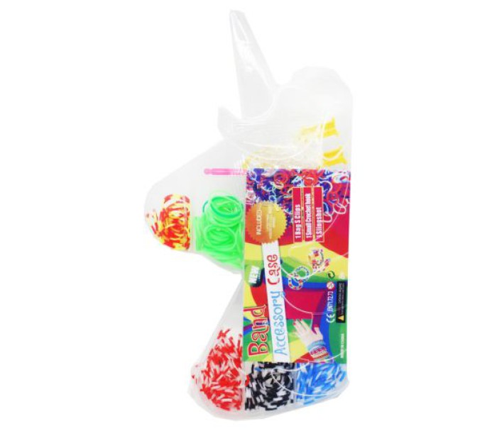 Набір яскравих різнокольорових резиночок в оригінальній напівпрозорій коробочці у вигляді єдинорога. У комплекті: сполучні гачки, гачок для плетіння, тримач та різнокольорові резиночки, за допомогою яких можна створювати різні прикраси на свій смак.