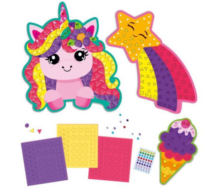 Набір для дитячої творчості "Веселий Єдиноріг". Складається з 3-х яскравих картонних основ та трьох мʼяких планшетів з елементами мозаїки. На основах контуром зображені підказки про те, які елементи потрібно клеїти. Набір допомагає малюкам розвинути дрібну моторику та відкрити нові творчі здібності. Розмір основи: 19х4 см.