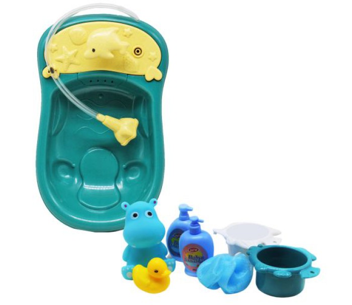 Яскравий набір для гри у ванній кімнаті. У комплекті є гумовий бегемотик-пищалка, мочалка, 2 горнтка з отворами (сито для води), пластикова качка та пляшка гелю для душу. Ванна оснащена душем - у спеціальний відсік ванни можна налити води, і при натисканні на кнопку у вигляді дельфіна вода надходитиме в душ через прозору трубку. Розмір ванни - 18х27х4 см.