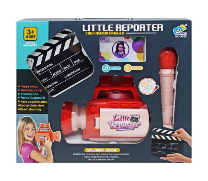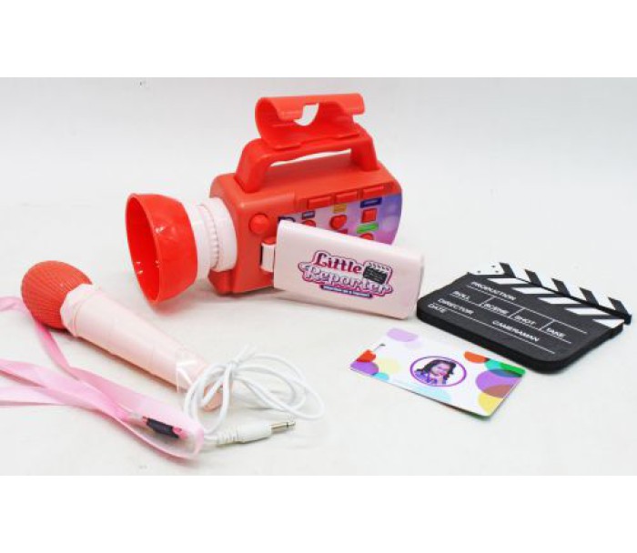 Ігровий набір, з яким дитина зможе відчути себе справжнім репортером. В комплект входить камера, мікрофон, бейджик репортера зі стрічкою та кінохлопушка. Камера відтворює веселі мелодії та різноманітні кумедні звуки, лінза світиться різними кольорами. Також є озвучення (англійською мовою): фрази репортера, що знаходиться на різних локаціях (на фоні чути звуки моря, зоопарку, дитячого майданчика та інше). Мікрофон підключається та кріпиться до камери. Розмір іграшки: 17х14х7 см. Працює від 3 батарей АА.