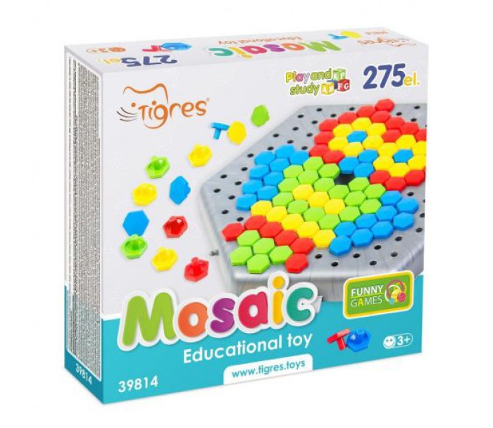 Мозаїка включає 275 елементів різних кольорів, розмір одного елемента 1,3 см. Комплект упакований у зручну пластикову коробочку яка перетворюється на ігрове поле зі спеціальними отворами для мозаїки. Для дітей віком від 3-х років.